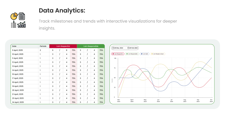 Self & Match is a behavioral self-monitoring system designed to help students take ownership of their actions while allowing users to track and support positive behaviors. It combines student self-assessment with user evaluation, and promotes accountability, reflection, and consistency in classroom behavior. Students rate their own behavior during specific time blocks using predefined questions. Users later review and "match" or "no match" those student responses based on actual behavior. The goal is to reinforce self-awareness and honesty, while also giving users valuable data.